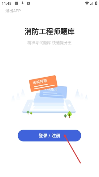 4、进入【消防工程师题库】页面后,找到并点击【登录/注册】按钮,即可进行账号的登录或注册操作。
