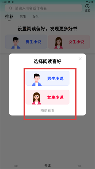1、在阅读偏好选择环节,选定【男生小说】或【女生小说】等分类,完成阅读偏好设置,以便获取精准的推荐内容。
