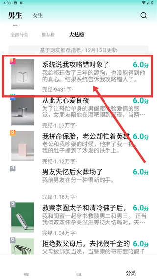 2、在对应分类的书籍列表里,找到你想找的书籍(比如《系统说我攻略错对象了》),点击进入这本书的详情页面。