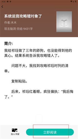 3、进入书籍详情页后,先确认内容无误,接着点击【立即阅读】按钮,即可进入书籍阅读界面开始阅读。