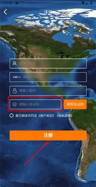 3、在账号注册页面输入验证码与密码,勾选相关协议后点击注册按钮,即可完成账号注册流程。