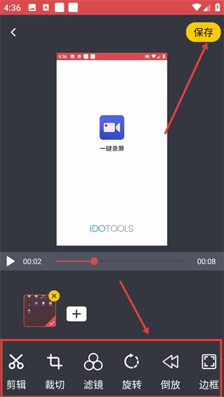 4、可以借助【剪辑】【裁切】【滤镜】这类工具对内容进行优化,操作完成后点击【保存】按钮就能导出录屏文件了。