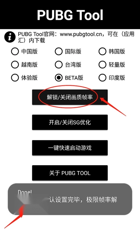 3、这时用户便进入了软件的主界面,接着依据自身游玩的版本进行挑选,选好之后点击“解锁画质帧率”按钮就行。