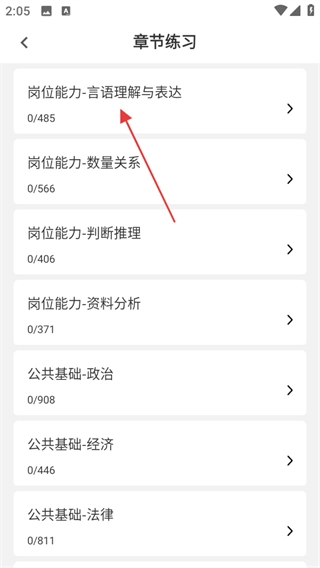在分类页面中,找到并选择“岗位能力言语理解与表达”这一选项,随后即可进入对应的子章节列表页面。