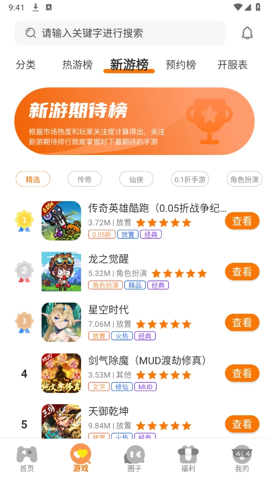 首页和游戏栏目汇集了丰富的游戏资源,涵盖新游、热搜榜以及预约榜单等内容。