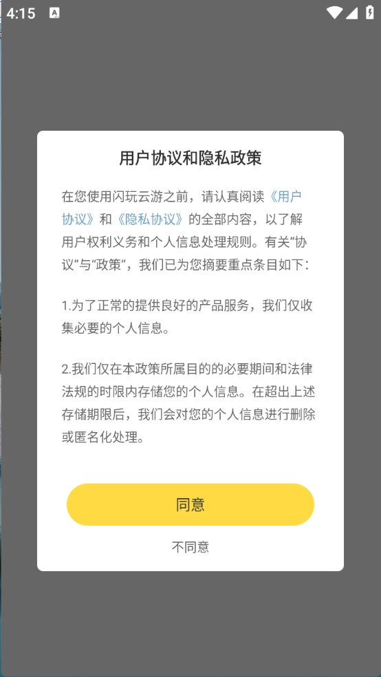 1、首先在本站完成闪玩云游的安装,然后查看并同意隐私政策与用户协议。