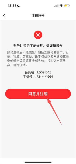 5、进入确认页面后,点击“同意并注销”按钮,即可完成账号注销流程。