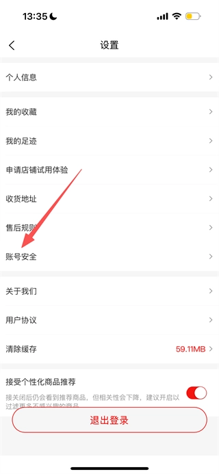 3、进入设置页面后,找到并点击账号安全选项,即可进入账号安全页面。