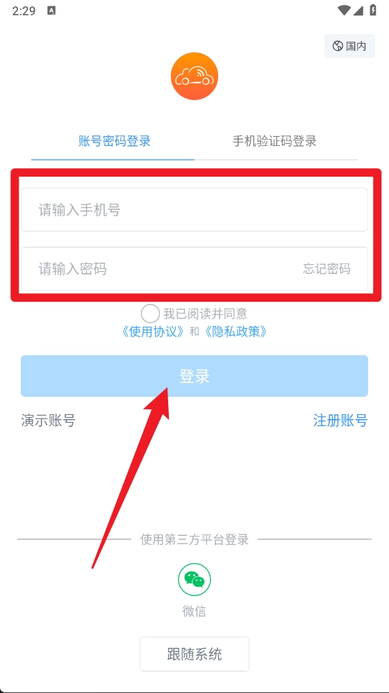 2、进入登录页面后,可选择输入手机号与密码的方式登录,也能通过手机验证码实现快捷登录,在此过程中需勾选同意协议内容,之后点击登录按钮即可。