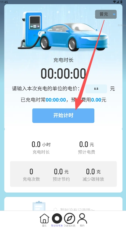 2、进入充电页面后,点击“开始计时”按钮,系统便会启动充电时长的记录,并同步计算出预估的充电费用。
