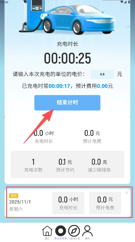3、充电完成后,点击“结束计时”按钮,页面就会呈现出本次充电的完整数据统计结果。
