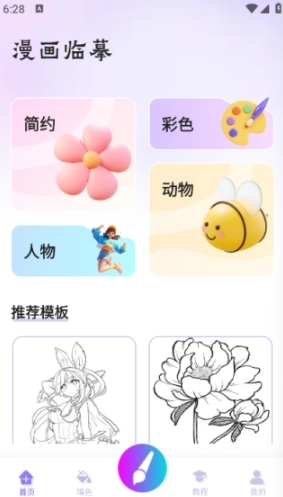 1、首页配备简约、彩色、人物、动物等临摹素材以及推荐模板。