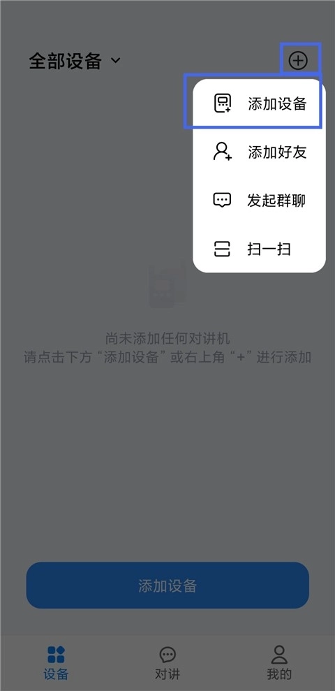 2、用户还能点击右上角的+标识,再点击【添加设备】进入。