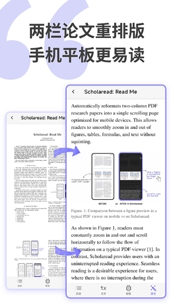1.自主研发的领先PDF重排算法,能彻底消除移动设备上阅读双栏论文时的排版问题