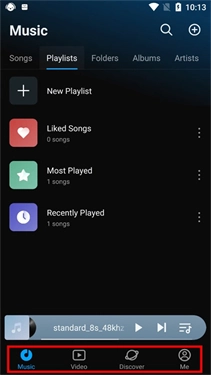 我们打开Lark Player,这款软件目前还没有中文版本,界面默认显示英文,但实际操作起来并不复杂,和大家日常使用的音乐播放器在功能逻辑上很相似。刚进入软件时,能看到界面主要分为四个板块,分别是音乐、视频、发现和我的。