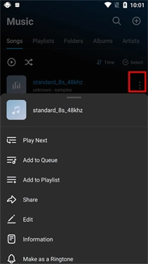 ②任意点击一首歌曲旁的三点图标,在这个界面中,你可以进行切换下一首、添加至播放列表、删除、设为铃声等操作;