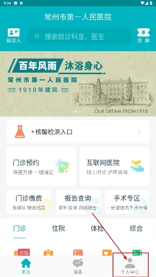 1、在常州市第一人民医院界面底部,点击【个人中心】按钮,进入对应功能页面以便进行后续操作。