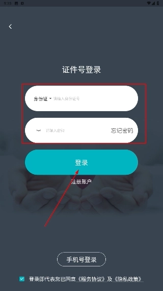 4、在证件号登录界面,按顺序填写【身份证号】和密码信息,确认无误后点击【登录】按钮,即可完成账号登录操作。