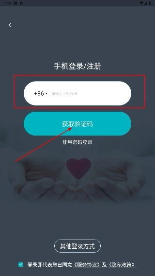 2、在手机登录或注册界面中,先在【请输入手机号码】的输入框内填写相关信息,之后点击【获取验证码】按钮来获取验证信息。