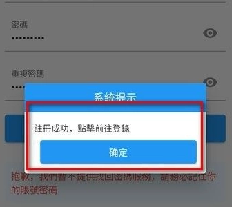 4、若用户名和密码满足要求,系统会弹出提示框显示“注册成功,点击前往登录”;