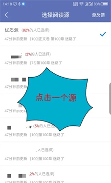 点击源之后,会进入选择阅读源的界面。通常情况下,默认的源都是优质的,当然你也可以自行挑选其他源,只需点击一下即可。
