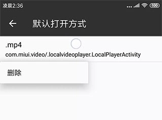 进入管理界面后,长按指定类型并点击删除,即可取消mp4文件的打开方式设置。