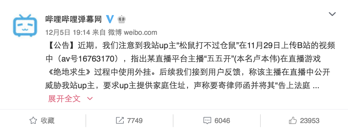 《绝地求生》外挂事件还没有彻底解决,斗鱼“台柱”卢本伟(五五开)近日又吃鸡被指出开挂遭实锤?网游主指出五五开在游戏过程中使用外挂,不过卢本伟一口否决。而B站UP主“松鼠打不过仓鼠”上传了一系列搜集到的视频证据,指出五五开的确在《绝地求生》中使用了外挂。