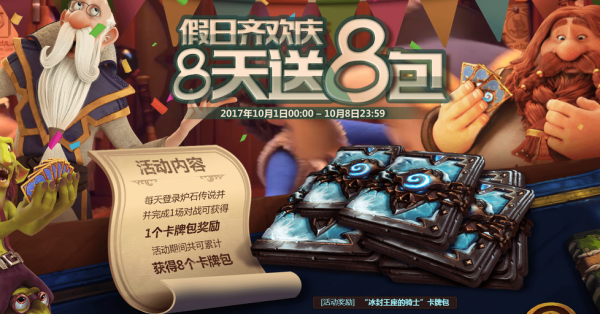 炉石传说国庆活动,国庆节活动内容。十一长假即将到来,不管是您是出游在外,还是宅在家中,都可以随时随地的玩上一把炉石传说,同时节日期间更有良心好礼大派送!那炉石传说有什么国庆活动?只要您在国庆期间每天登录游戏并完成1场对战,就能获得1包“冰封王座”的卡牌包,总共有8包等你来领取!下面就来看看具体的国庆节活动内容介绍。