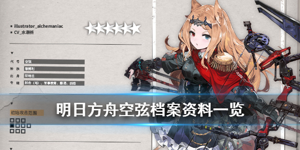 明日方舟空弦档案资料是什么?空弦是明日方舟在此地之外活动同期卡池中推出的六星狙击干员,那么空弦的满信赖档案资料是什么样的,讲了些什么故事呢?接下来就让我们一起了解一下吧。明日方舟空弦档案资料一览一、基础档案CV:水濑祈画师:alchemaniac【代号】空弦【性别】女【战斗经验】两年【出身地】拉特兰【生日】11月16日【种族】黎博利【身高】152cm【矿石病感染情况】参照医学检测报告,确认为非感染者。二、综合体检测试【物理强度】标准【战场机动】优良【生理耐受】标准【战术规划】标准【战斗技巧】优良